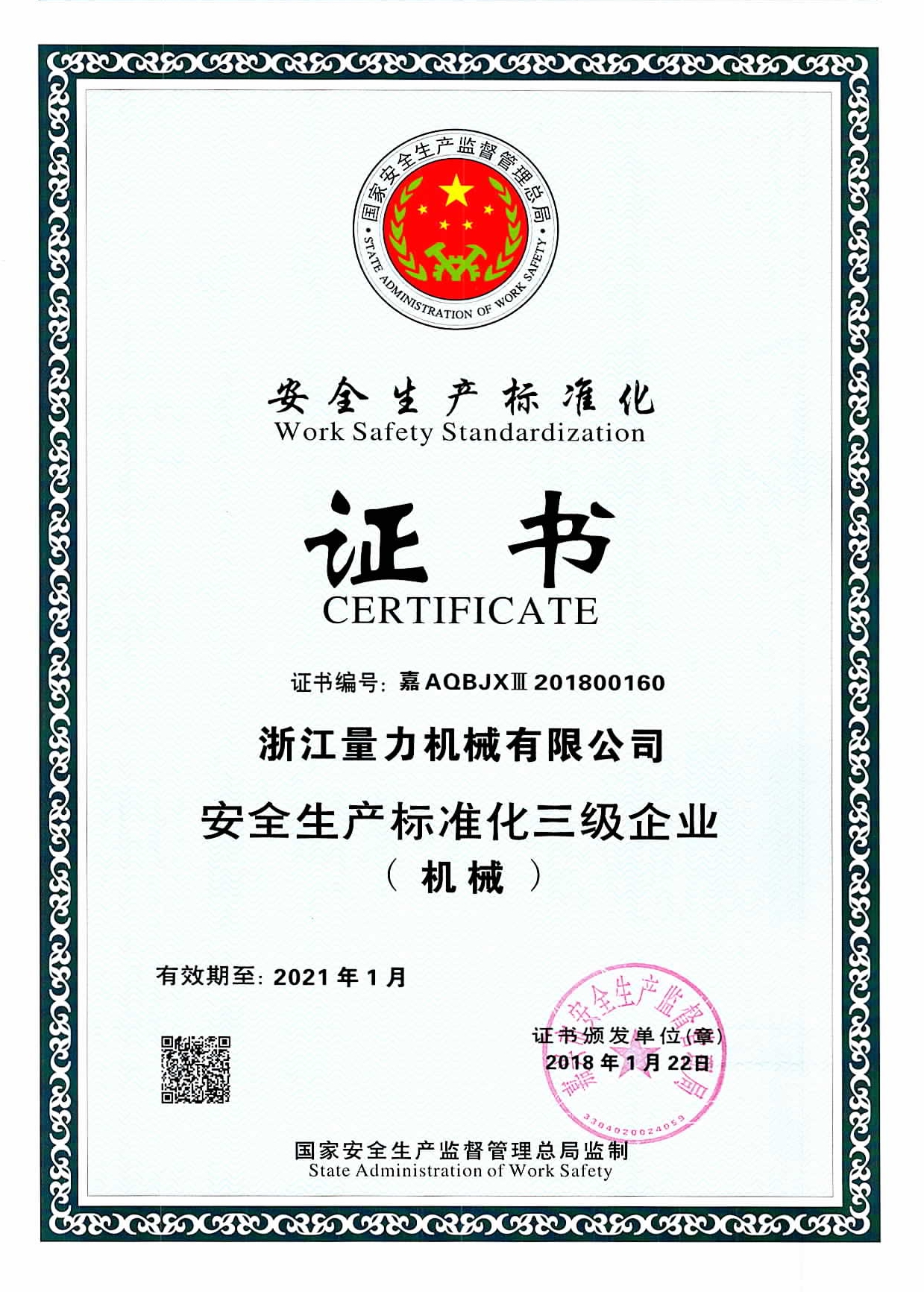 安全生产标准化三级企业证书(浙江)
