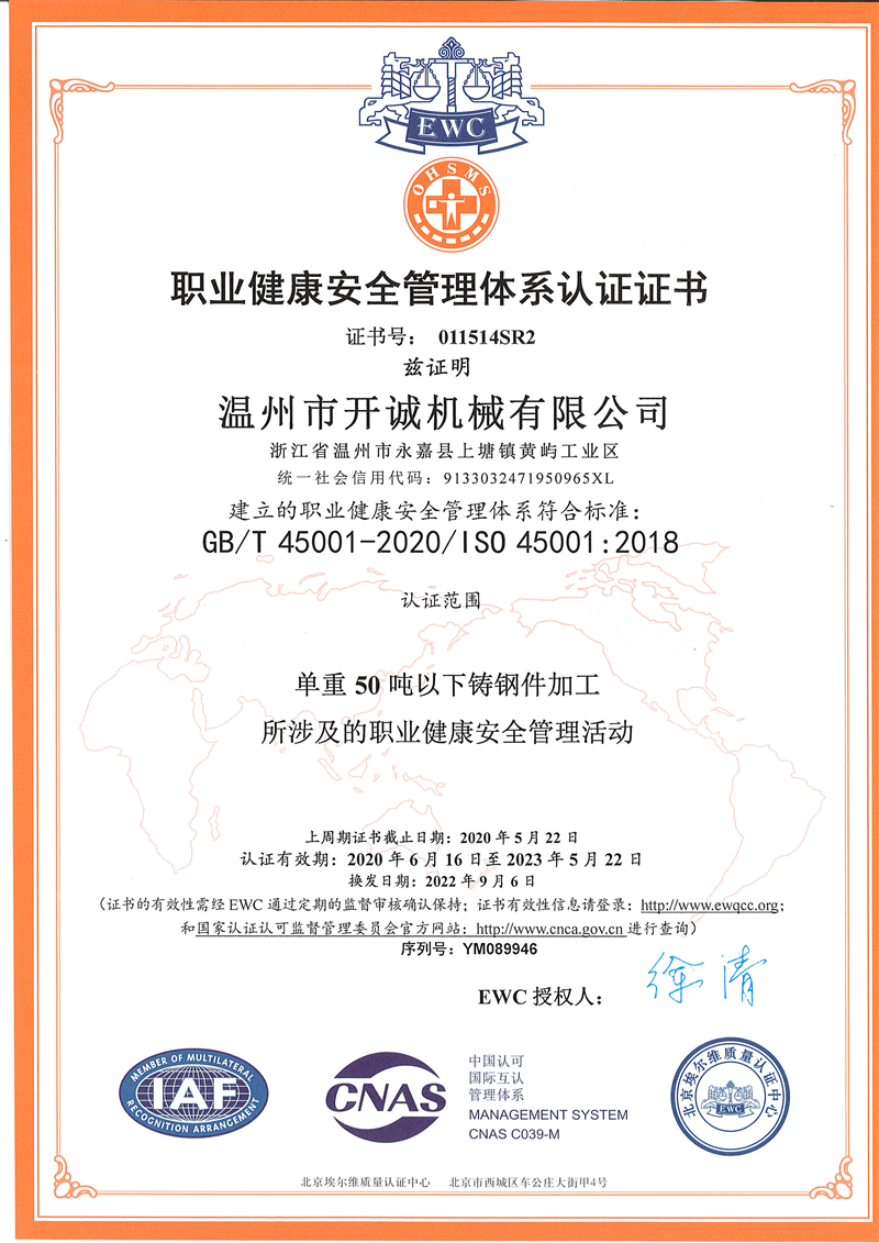 职业健康安全管理体系认证证书(温州)