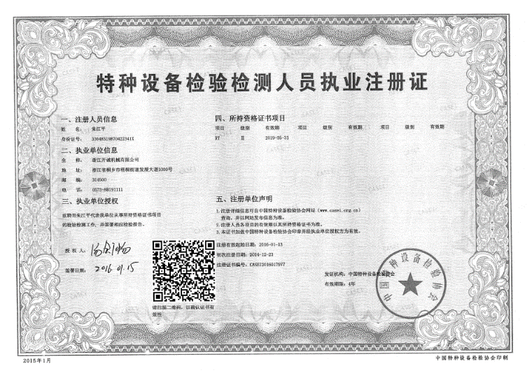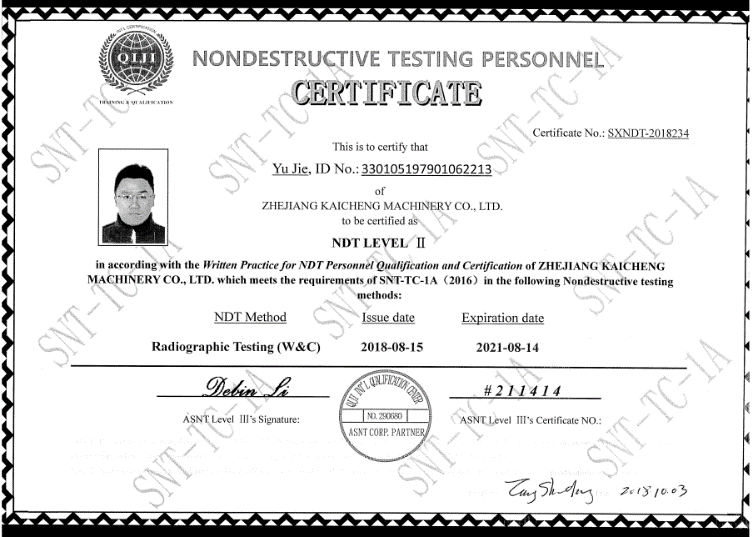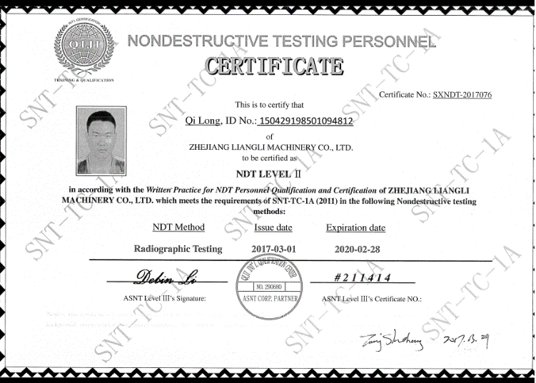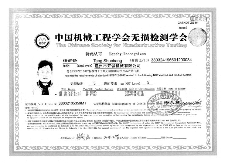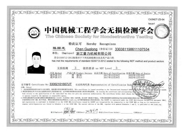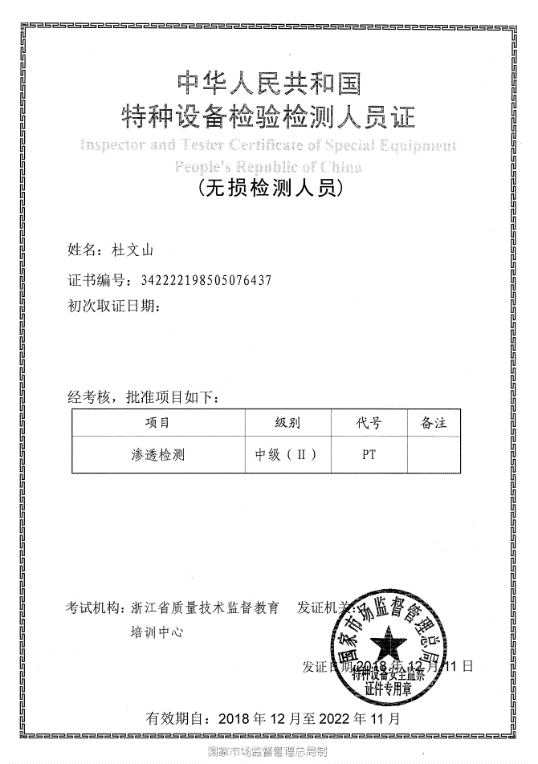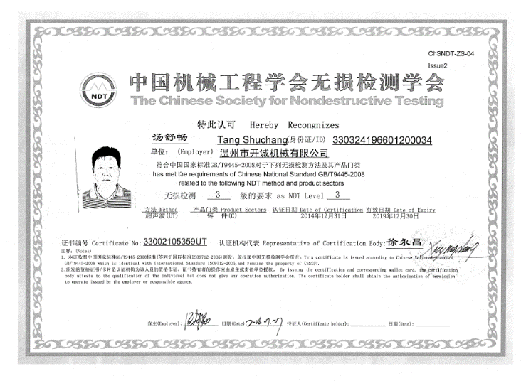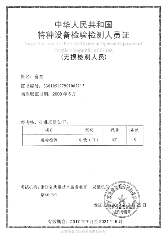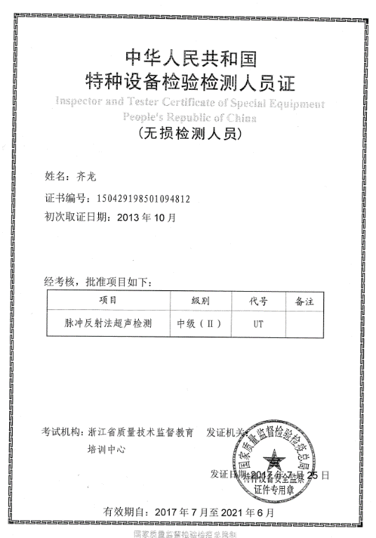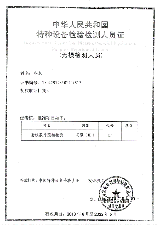 无损检测MT、PT、UT 、 RT证书,取证人员共计60人次。